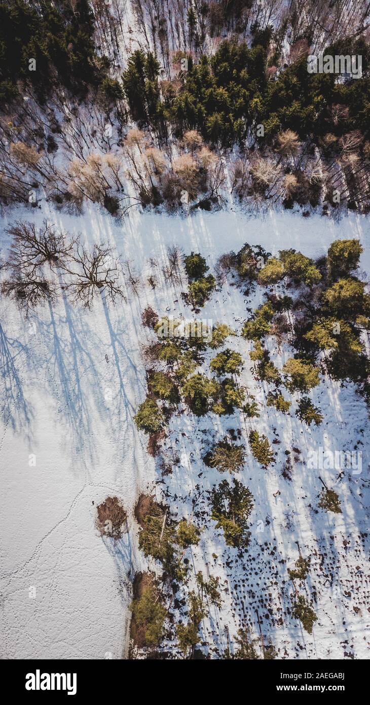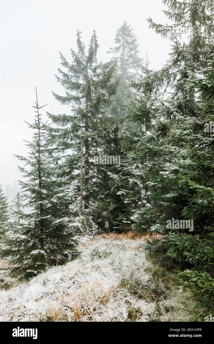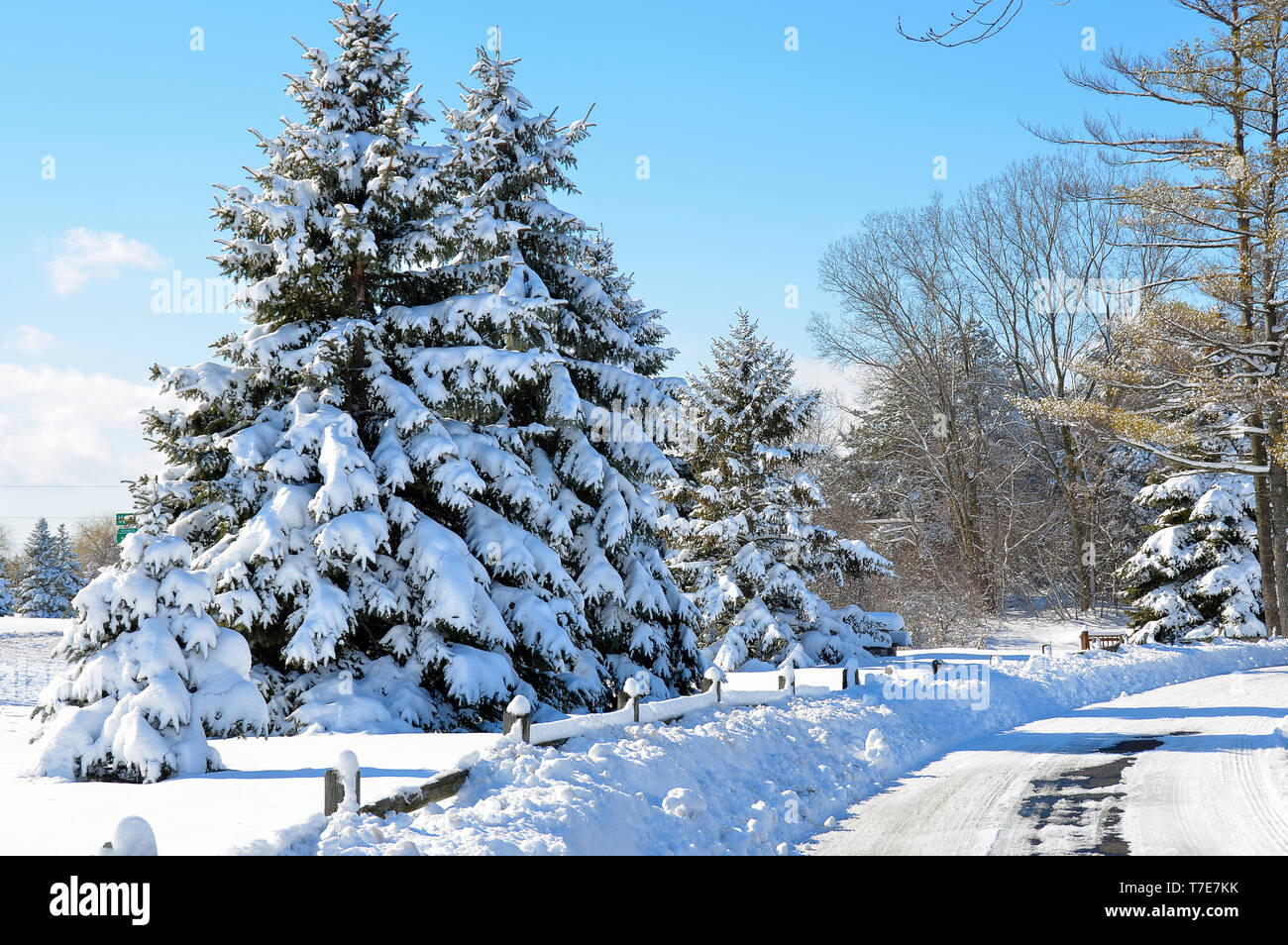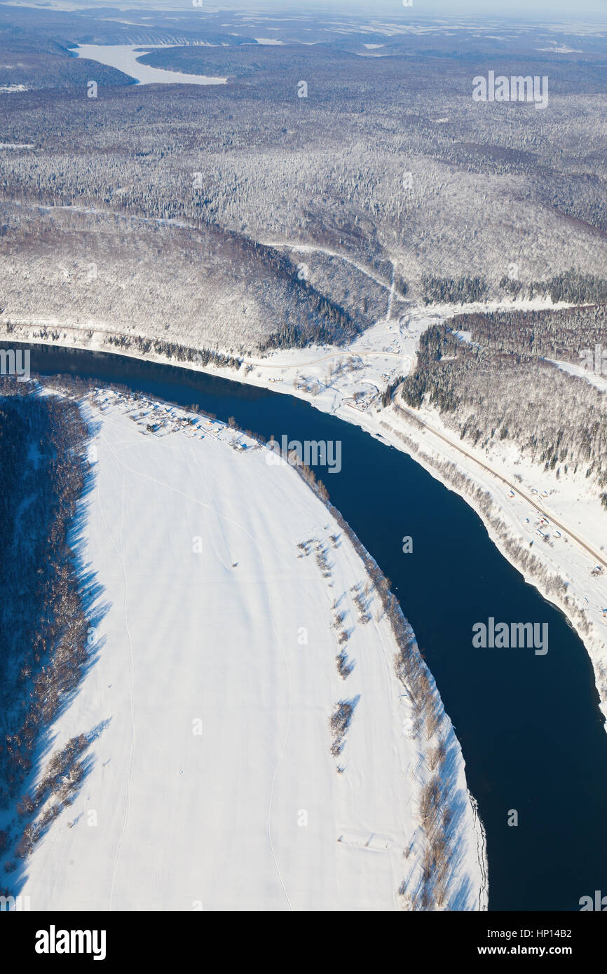 paisaje invernal con ilustración de río pinos y montañas congelados
